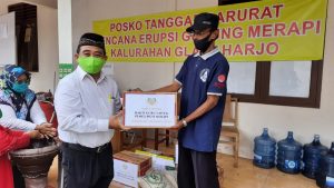 Rombongan 13 guru MAN 4 Sleman dipimpin Dwi Astuti Handayani.S.Pd wakil kepala madrasah.  Penyerahan secara simbolis oleh Edy Purwanto,S.Pd diterima Surono Kamituwo Glagaharjo dan Suparno petugas di barak pengungsian kelurahan setempat.   Rombongan kemudian menempati kursi-kursi yang sudah disediakan bagi tamu, di batas masuk menuju barak pengungsi.  “Semua yang akan masuk di sini harus swab, semua wajib mengikuti protocol Kesehatan upaya memutus covid-19, menjamin kesehatan pengungsi.  Ada beberapa bagian seperti logistic pangan dan gizi, Pendidikan, Kesehatan, keamanan semua terdata dan terjadwal.  Agar tidak kecapaian, kegiatan anak-anak terjadwal dengan baik,” jelas Hanifatun Naimi salah satu petugas PPA (Perlindungan Perempuan dan Anak) di Glagaharjo.  Menurut wanita yang biasa dipanggil Mab Ifah itu, Pemerintah Kabupaten Sleman memang mendirikan Posko PPA sebagai upaya perlindungan karena barak pengungsian dihuni banyak lansia, ibu hamil dan anak-anak.