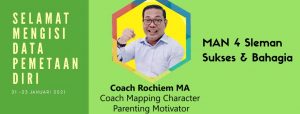 Sleman (MAN 4 Sleman) – Masa pandemi dengan belajar di rumah bisa menyebabkan galau hingga kurang terarah dalam melangkah.  Padahal setiap siswa memiliki potensi untuk berkembang, namun bila belum mengetahui dan belum menyadari bisa salah langkah.  Maka sangat perlu mengenali potensi diri dengan pemetaan atau mapping serta pendampingan.  “Dimulai dengan koordinasi para wali kelas dengan Guru Bimbingan dan Konseling (BK)  dengan pemandu dari coach Rochim MA dari RMA Institute.  Kemudian dilakukan kelompok per peminatan / jurusan kelas.  Masing-masing juga diampu oleh coach Rochim untuk pendampingan,” jelas Dwi Astuti Handayani,S.Pd wakil kepala madrasah urusan (wakaur) kesiswaan Jum’at (22/01/2021) secara virtual.  Semua dilakukan secara virtual mengingat masih masa pandemi, jelasnya.