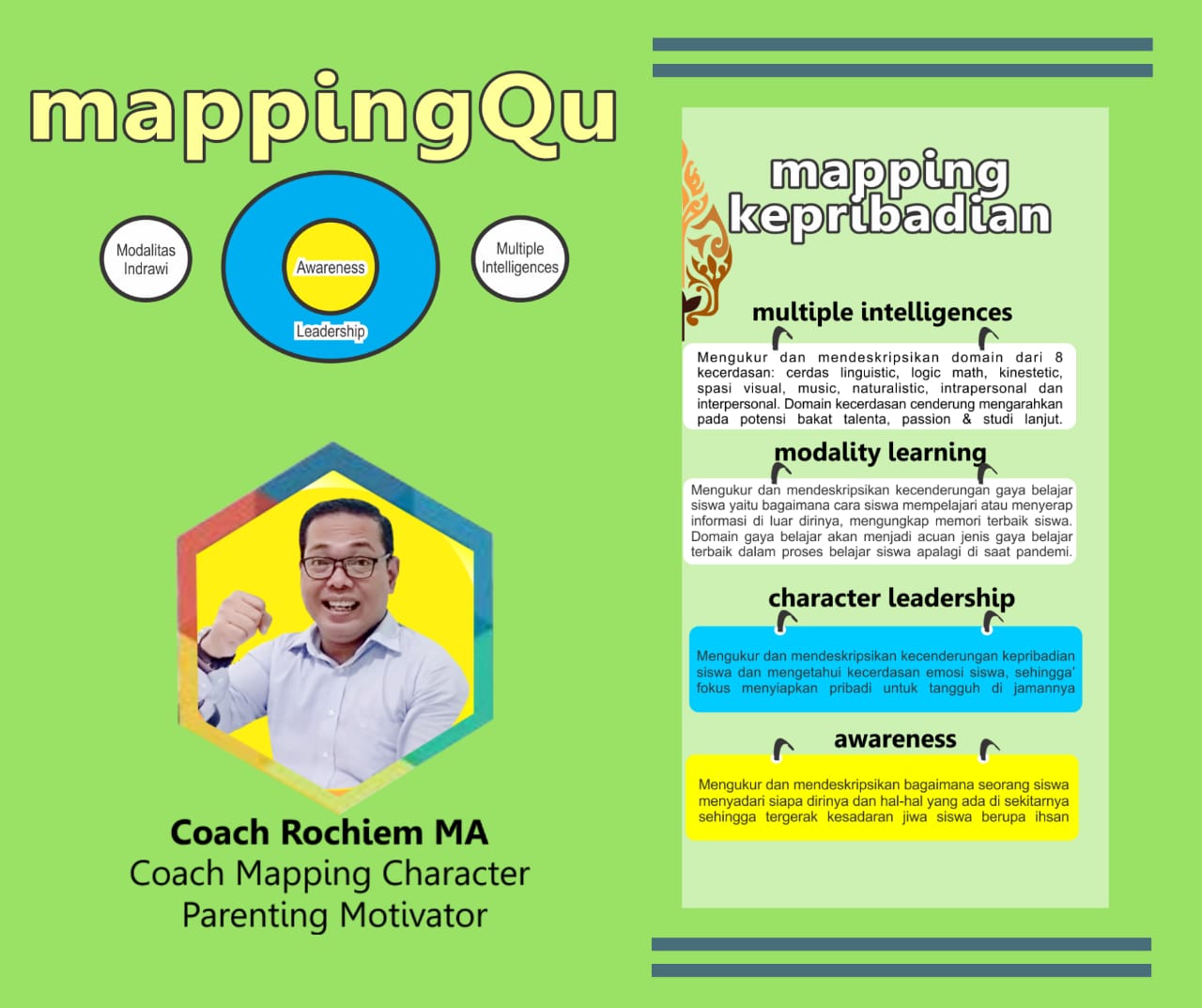 “Ini adalah program madrasah sebagai ikhtiar madrasah dalam menemukan potensi diri pada setiap siswa.  Mereka mempunyai potensi kecerdasan, bakat talenta, passion, gaya belajar, karakter, kesadaran diri, visi hidup dan penjurusan studi lanjut, siswa agar lebih terarah, optimal saat pembelajaran terutama di masa pandemi covid ini,” lanjut Dwi.  Kelas pendampingan atau coaching ini akan bersinergi dengan masing-masing orang tua agar lebih maksimal.  Kelas ini akan diampu rutin oleh Coach Rochiem MA, tegasnya.  Coach Rochiem masuk dalam setiap grup dengan opening dan melakukan pendataan dengan memberikan  link google form beserta teknisnya.
