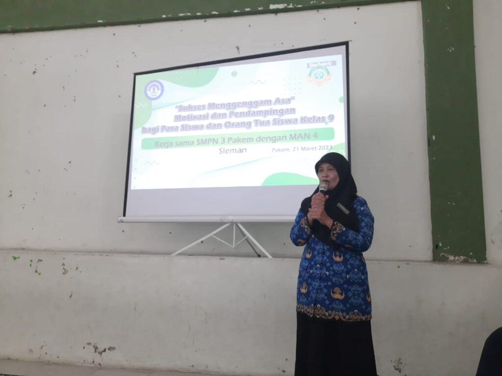 Sleman – Persiapan meraih sukses Assessment Standar Pendidikan Daerah (ASPD) sudah banyak dilakukan SMP Negeri 3 Pakem seperti pemberian pelajaran tambahan, uji coba (try out) baik tingkat sekolah maupun provinsi. “Semua punya potensi untuk sukses, maka menghadapi ASPD harus dipersiapkan dengan sebaik-baiknya,” pesan Cahayaningsih,M.Pd kepala SMP Negeri 3 di hadapan 127 peserta didik kelas 9 bersama orang tua dan wali di aula 1 MAN 4 Sleman Selasa (21/3/2023). Dukungan dari orang tua berupa perhatian dan pendampingan sangat dibutuhkan, tegas Cahayaningsih. Kegiatan bertajuk bersama menggenggam asa itu merupakan kerja sama antara SMP Negeri 3 Pakem dengan Tim Motivasi MAN 4 Sleman.